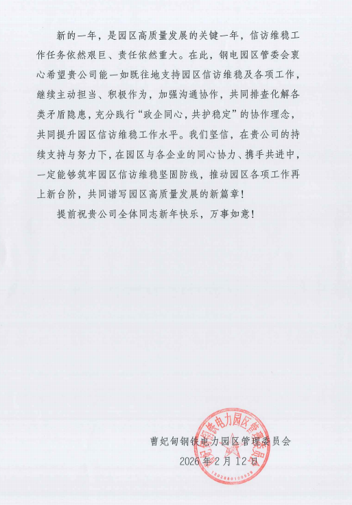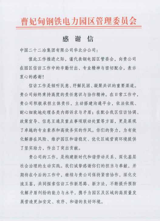 2月12日,華北公司收到曹妃甸鋼鐵電力園區管理委員會感謝信。在感謝信中,曹妃甸鋼鐵電力園區管理委員會對華北公司在園區信訪工作中的辛勤付出、專業精神與密切配合,表示了感謝。