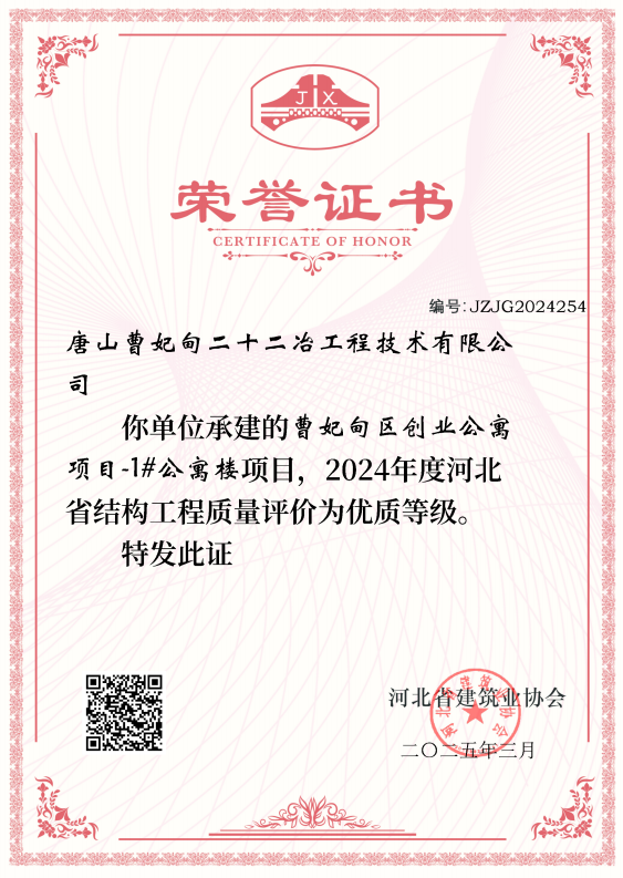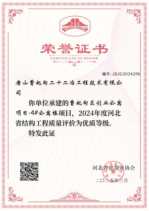 近日,曹妃甸技術公司曹妃甸區創業公寓項目1、2、4號公寓樓分別榮獲河北省結構優質工程獎。