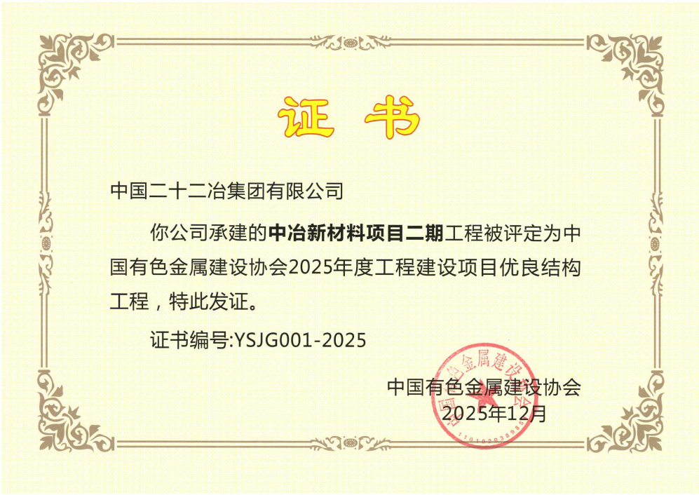 近日獲悉,華北公司中冶新材料二期項(xiàng)目獲評(píng)2025年度工程建設(shè)項(xiàng)目優(yōu)良結(jié)構(gòu)工程。
