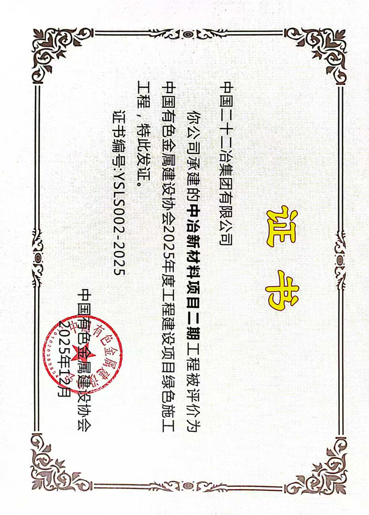 近日獲悉,華北公司中冶新材料二期項目被評為中國有色金屬建設(shè)協(xié)會2025年度工程建設(shè)項目綠色施工工程。
