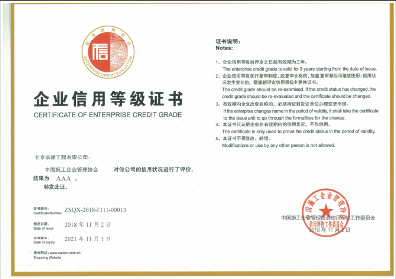 北京崇建公司被評定為2020年度工程建設...