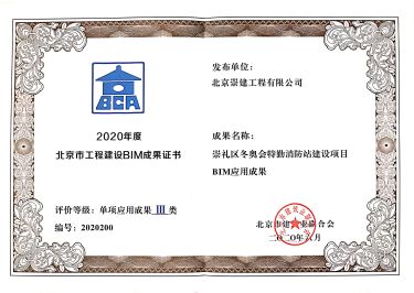 7月21日收到證書,北京崇建公司“崇禮區冬奧會特勤消防站建設項目BIM應用成果”被評為2020年度北京市工程建設BIM單項應用成果Ⅲ類。