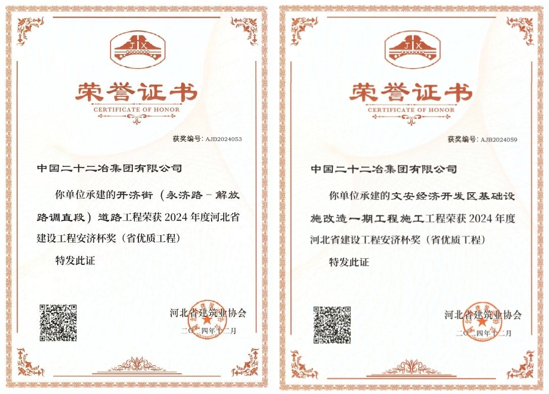 近日,河北省建筑業協會公布2024年度河北省建設工程安濟杯獎(省優質工程)獲獎工程名單。路橋公司承建的滄州市政項目開濟街道路工程、文安經濟開發區基礎設施改造一期工程獲此殊榮。