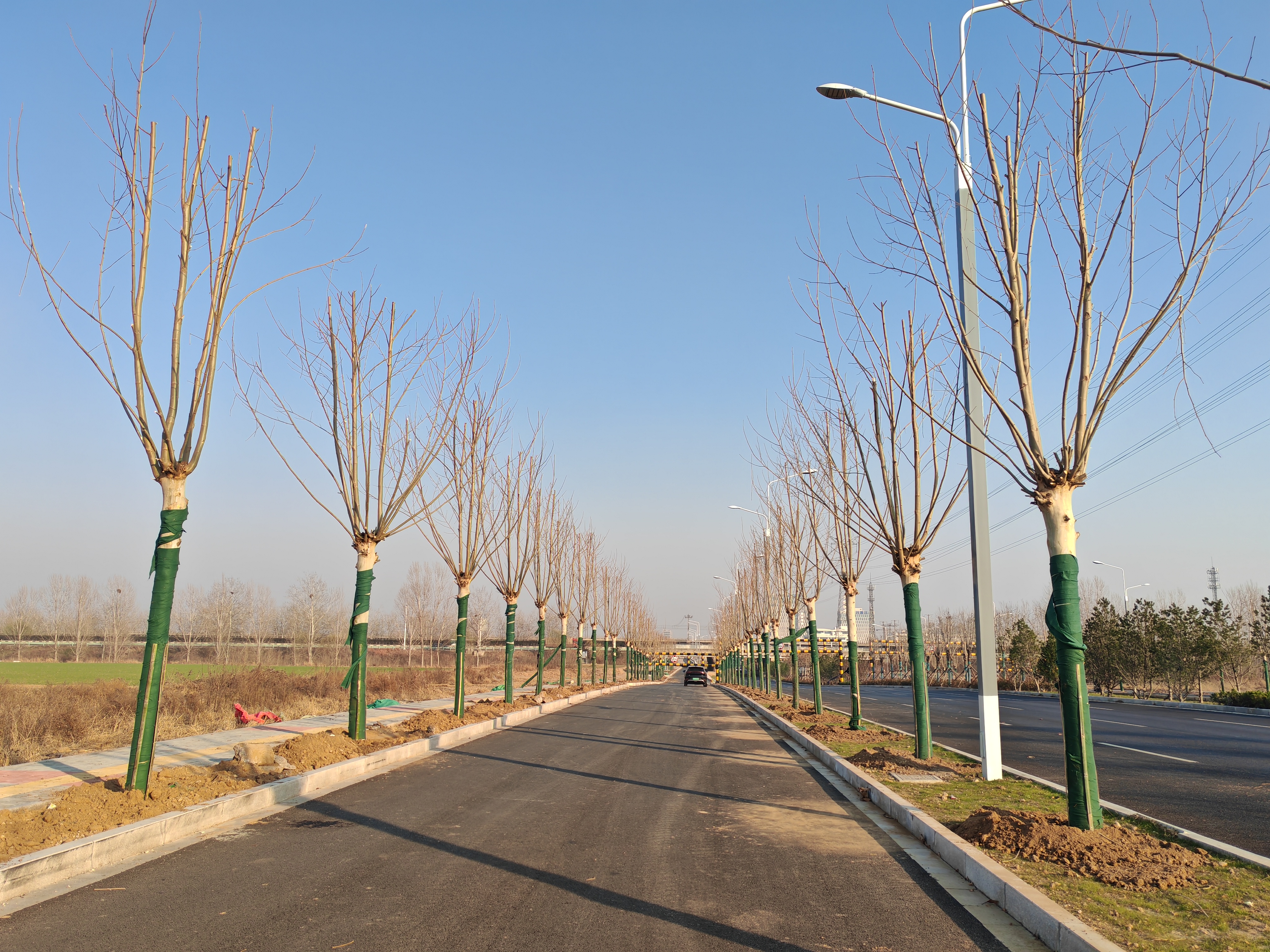 為確保苗木栽種成活率與施工質量,項目提前謀劃、精準施策,從前期準備到現場施工全程嚴把“質量關”。施工過程中,技術質量人員全程駐場指揮,根據苗木規格調整吊車吊裝角度與力度,確保樹木整體平穩吊運、精準入坑;施工人員隨即進行人工微調,校正苗木朝向與垂直度;測量人員同步啟用全站儀實時監測,反復核對每株苗木的順直度,確保道路兩側苗木排列整齊、線型流暢;最后由施工班組分層回填種植土并壓實,完成整套栽種流程。在各環節無縫銜接、全體人員目標一致的協作下,順利完成全部綠化苗木栽種任務。