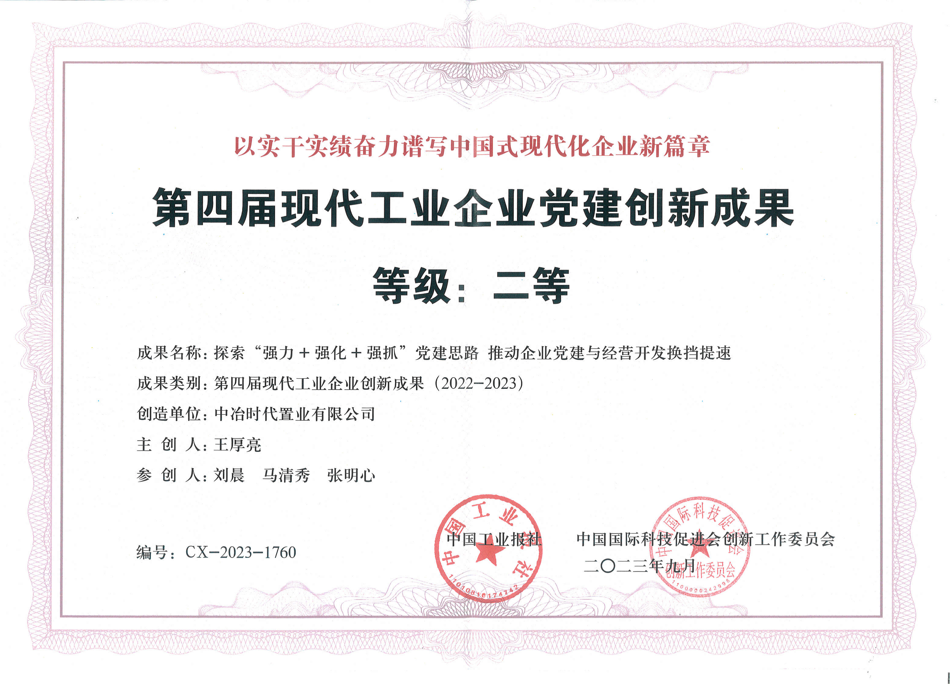 10月21日,在2023中國工業企業創新大會暨第四屆現代工業創新成果發布儀式上,時代置業公司申報的《探索“強力+強化+強抓”黨建思路 推動企業黨建與經營開發換擋提速》獲黨建創新成果二等獎,并被收錄至全國創新案例。