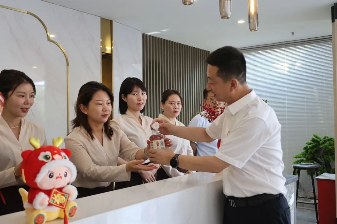 在浭陽新城售樓處,張學鋒向置業顧問表達了親切的問候,對她們忠于職守、勤勤懇懇的敬業精神表示充分肯定,并將清涼飲料送到她們手中,叮囑她們在堅守崗位的同時要注意防暑和安全,以更好的狀態投入到銷售工作中。