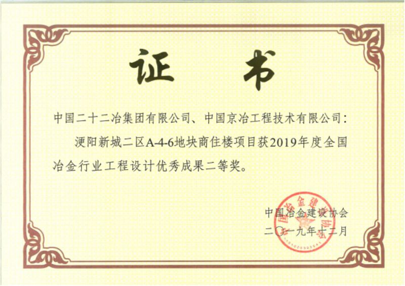 中國二十二冶集團(tuán)有限公司設(shè)計院喜獲中國冶金協(xié)會優(yōu)秀設(shè)計成果二等獎