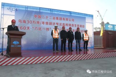 5月1日,市政公司2020年大干60天“六比一創”建功立業勞動競賽啟動儀式在烏海30萬噸/年熔融還原法高純鑄造生鐵項目部拉開帷幕。賽思普科技有限公司副總經理周海川同志,二十二冶集團公司工會綜合管理部業務主管常洪文同志,市政公司黨委副書記、紀委書記、代理工會主席季濤同志,市政公司總會計師盧衛兵同志以及烏海項目相關人員出席此次活動。